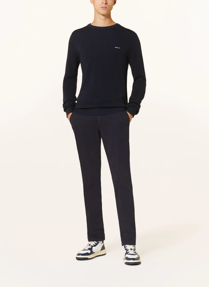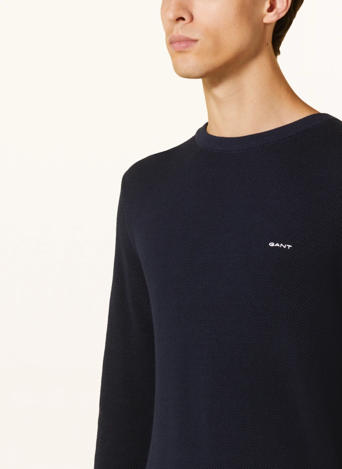 Структурная вязка. Прямого покроя. Ребристый круглый вырез. Ребристые манжеты и подол. Вышивка логотипа на высоте груди. Чистый хлопок