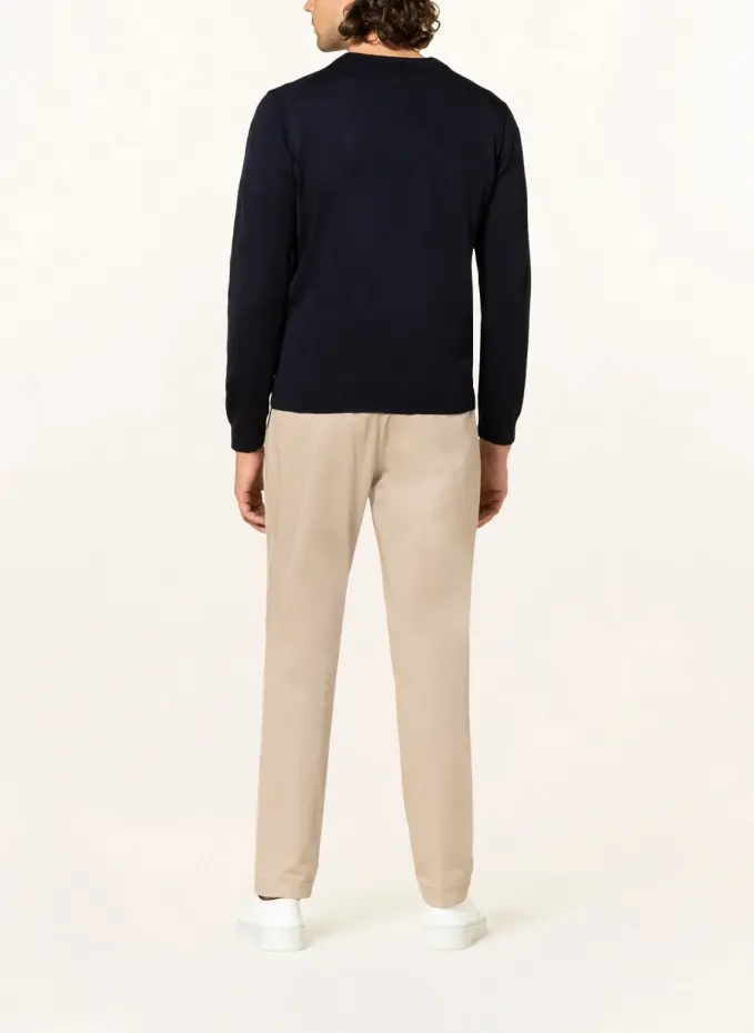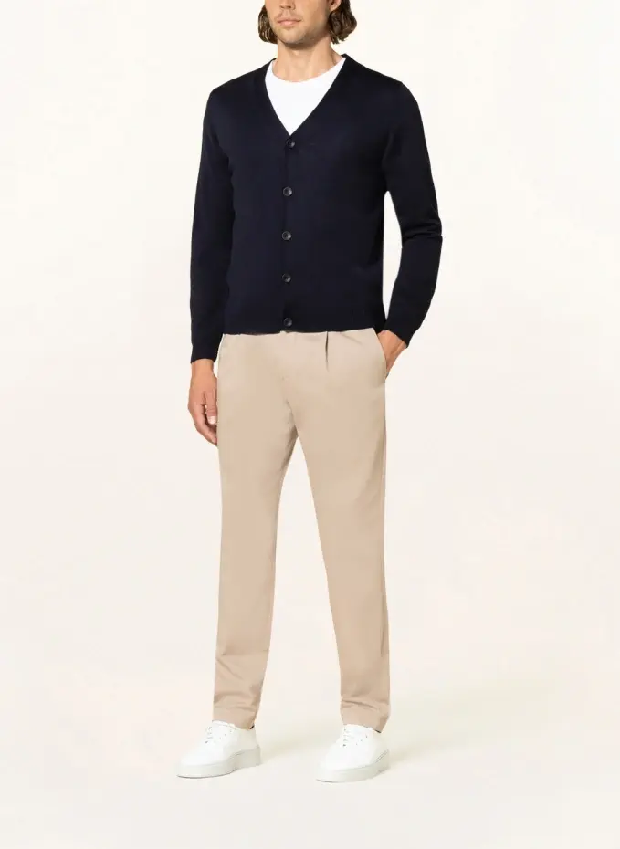 Тонкая вязка. Индивидуальный крой. V-образный вырез. Закрывается на кнопки. Ребристые манжеты и подол