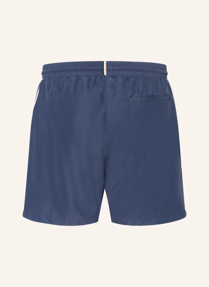 Из линейки BOSS Black. Эластичный пояс со шнурком. Боковые карманы. Задний карман на застежке-липучке. Интегрированные сетчатые трусы. Контрастная окантовка по бокам. Отпечаток этикетки на ноге