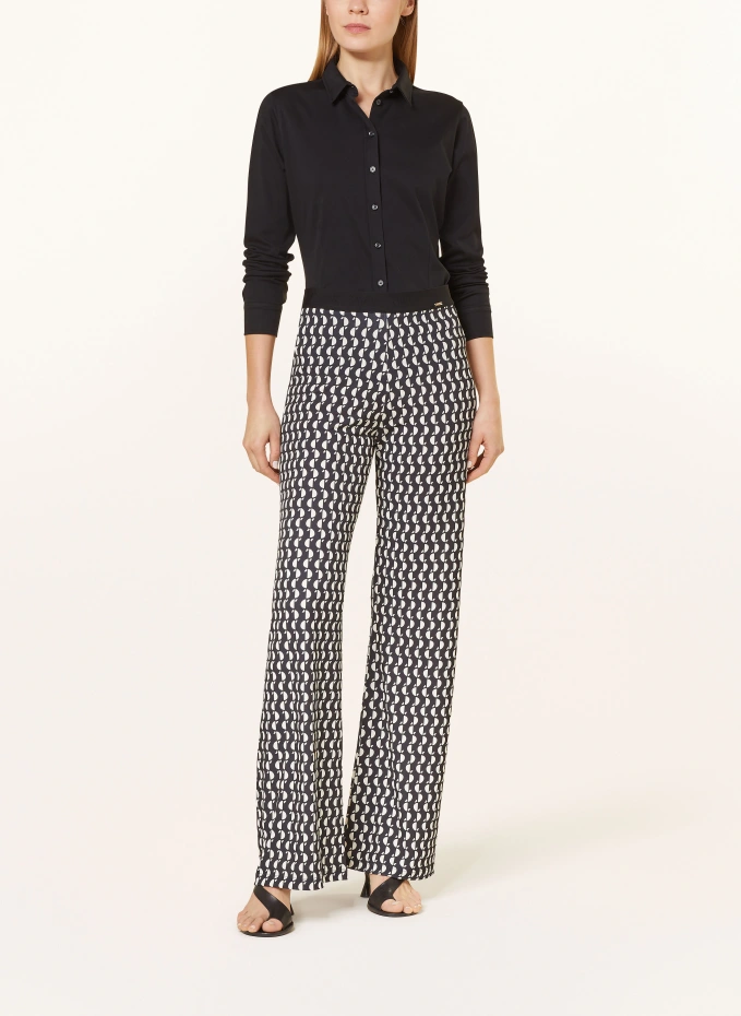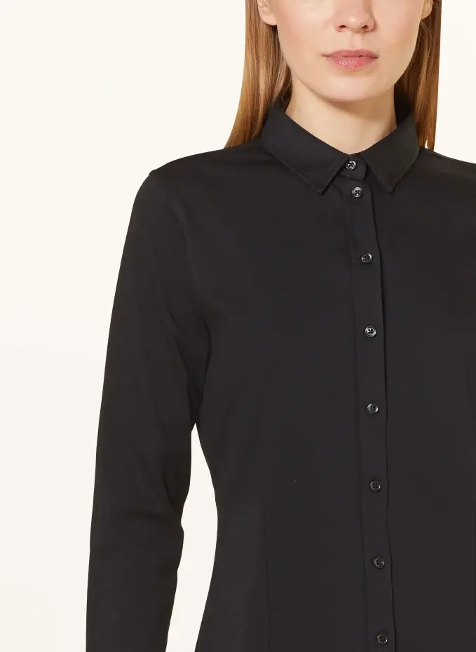 Прямого покроя. Воротник рубашки. Застегивается на непрерывную планку с пуговицами. Манжета на одну пуговицу. Вытачки, подчеркивающие фигуру, спереди. Закругленный край. Удлиненная задняя часть. Спереди золотистая аппликация с логотипом. Эластичное качество из хлопка.