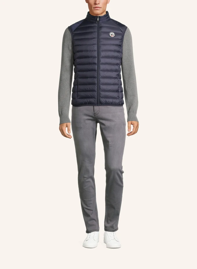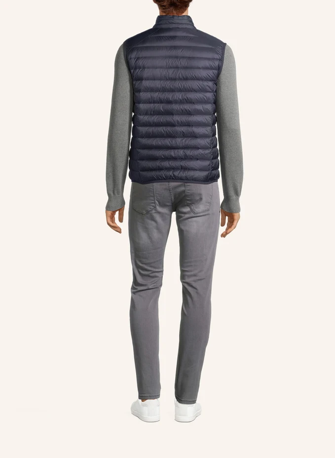 Атласный, стеганый и водоотталкивающий материал. Пухово-перьевой наполнитель с сертификатом «RDS». Плотный разрез. Стеганый воротник-стойка. Боковые карманы. Контрастные по цвету внутренние швы. Оригинальный фетровый логотип на левом рукаве.