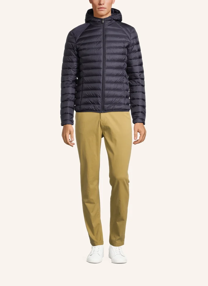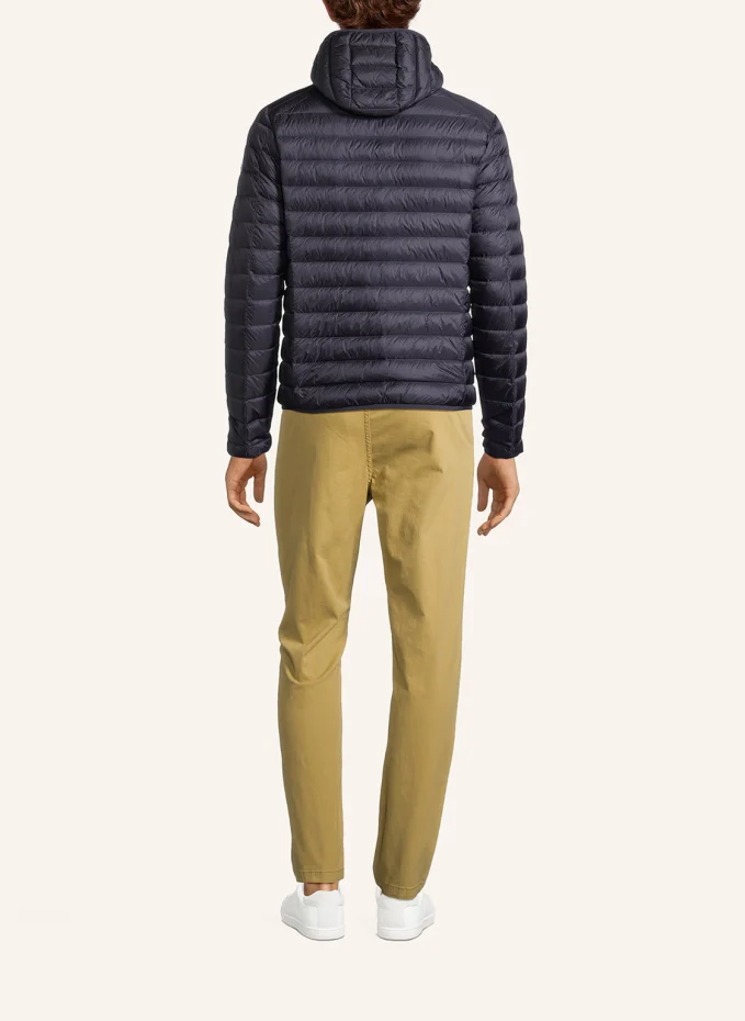 Атласный, стеганый и водоотталкивающий материал. Пухово-перьевой наполнитель с сертификатом «RDS». Плотный разрез. С толстовкой. Боковые карманы. Контрастные по цвету внутренние швы. Оригинальный фетровый логотип на левом рукаве.