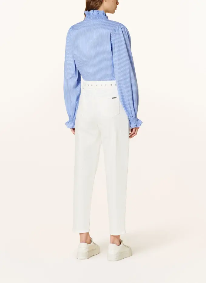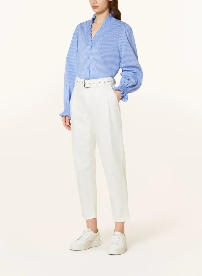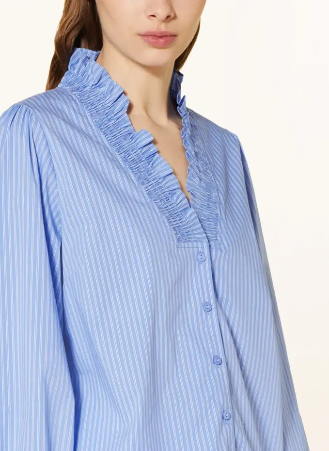 Прямого покроя. Воротник стойка с V-образным вырезом. Закрывается на непрерывную гладкую планку на пуговицах. Нежные рукава-баллоны. Эластичные присборенные манжеты на концах рукавов. Полосатый узор. Присборенный воротник и вырез с рюшами. Эластичная смесь хлопка