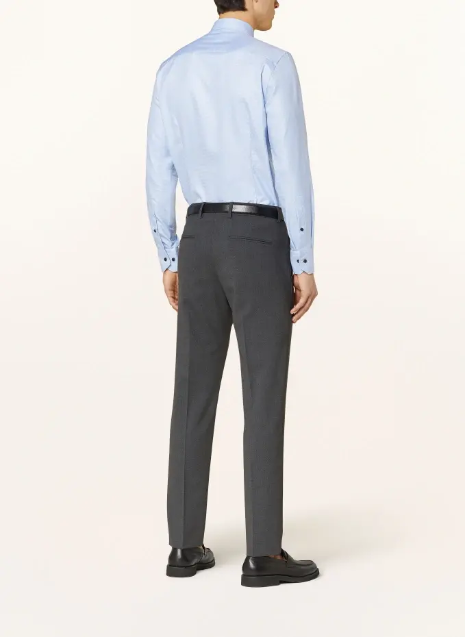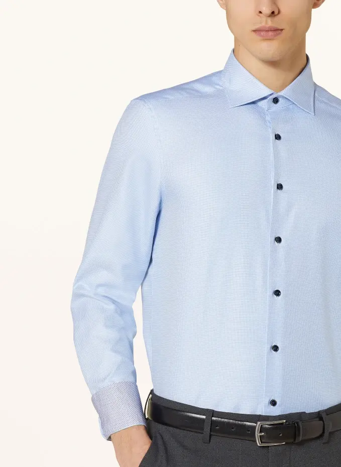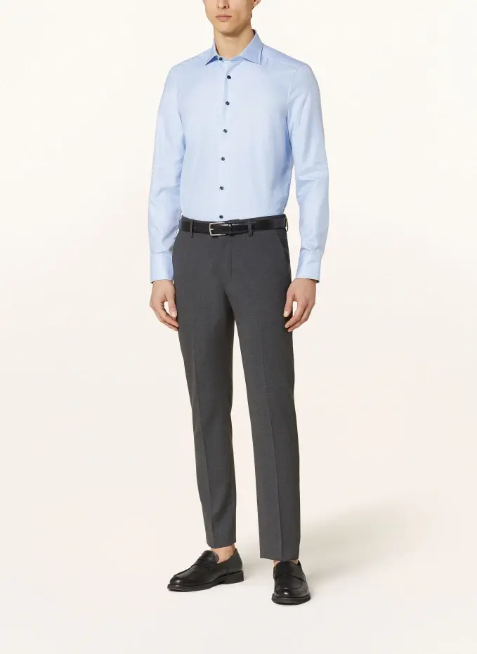 Посадка по данным производителя: Slimline Fit. Формируем вытачки на спине. Воротник «акула» со встроенными стойками и узорчатой отделкой. Широкая кокетка сзади. Гладкая планка с пуговицами. Регулируемая по ширине манжета на одной пуговице с узорчатой отделкой. Тонкий узор «гусиные лапки». Штукатурка с графическим узором. Двойной хлопок