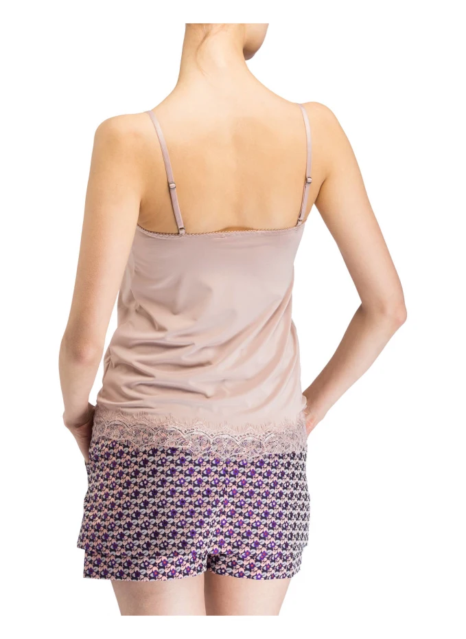 Прямого покроя. V-образный вырез. Кружевная отделка по вырезу и подоле. Регулируемые по длине бретели-спагетти. Качество растяжения