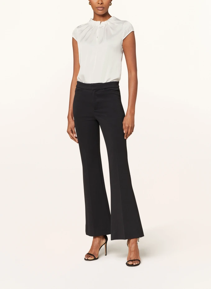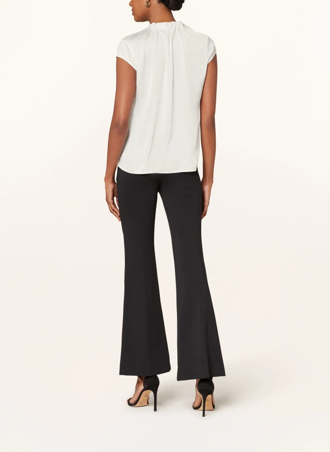 Прямого покроя. Воротник с рюшами. Домик-замочная скважина с пуговицей. Короткие разрезы по бокам. Эластичное качество