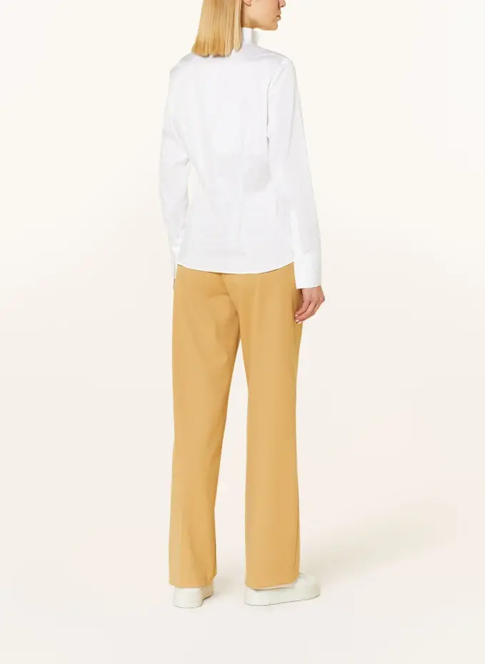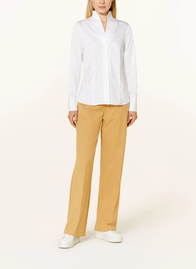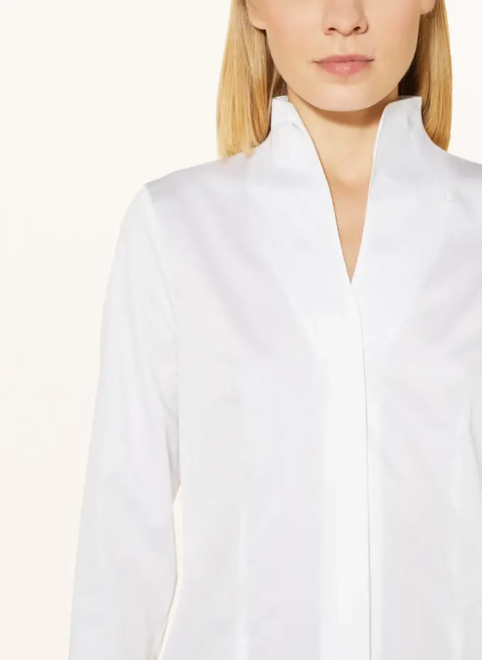 Индивидуальный крой. Поясные швы спереди и сзади. Неброский воротник-стойка с разрезным вырезом. Закрывается на потайную планку на пуговицах во всю длину. Манжеты на одной пуговице на концах рукавов. Закругленный край. Эластичная обработка. Атласное качество из хлопка.