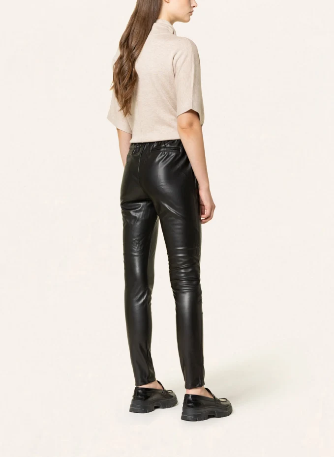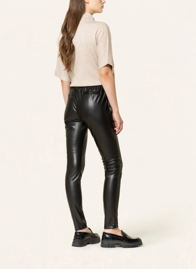 Эластичный пояс. Узкая ножка. Боковые карманы. Задние карманы. Кожаный вид