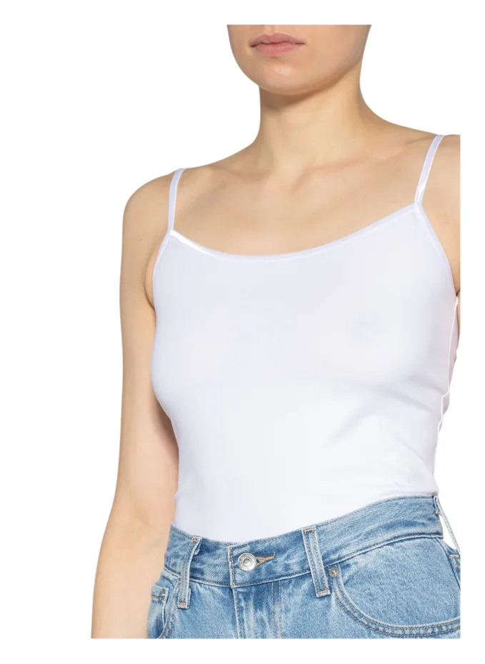 Прямого покроя. Круглый вырез. Ленты-спагетти. Деталь этикетки с отделкой драгоценными камнями по краю. Эластичный хлопок, качество.