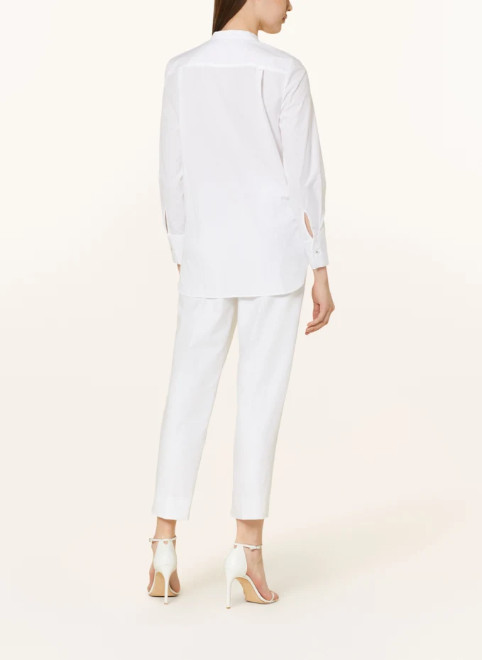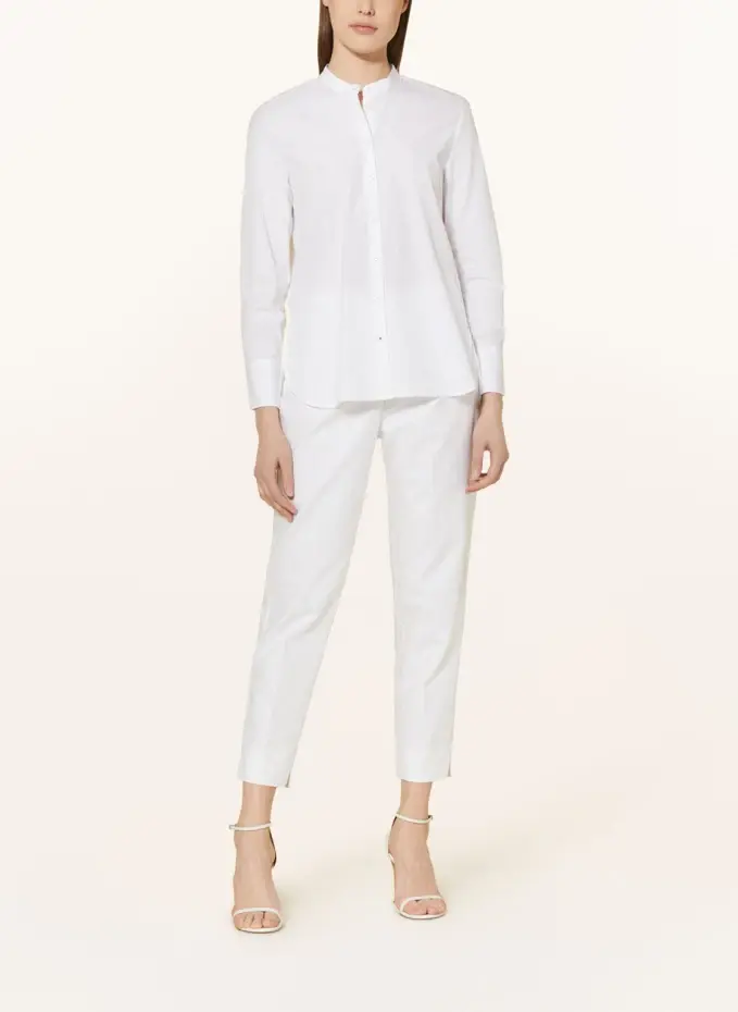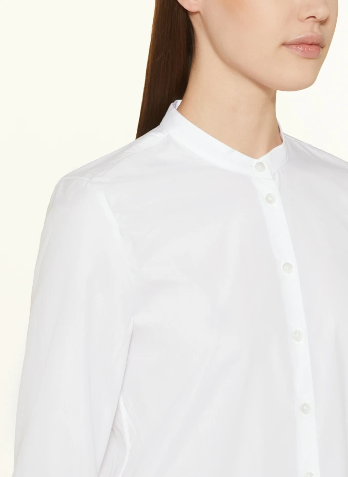 Прямого покроя. Воротник-стойка. Закрывается на непрерывную гладкую планку на пуговицах. Манжета на одну пуговицу. Закругленный край. Поплин. Чистый хлопок