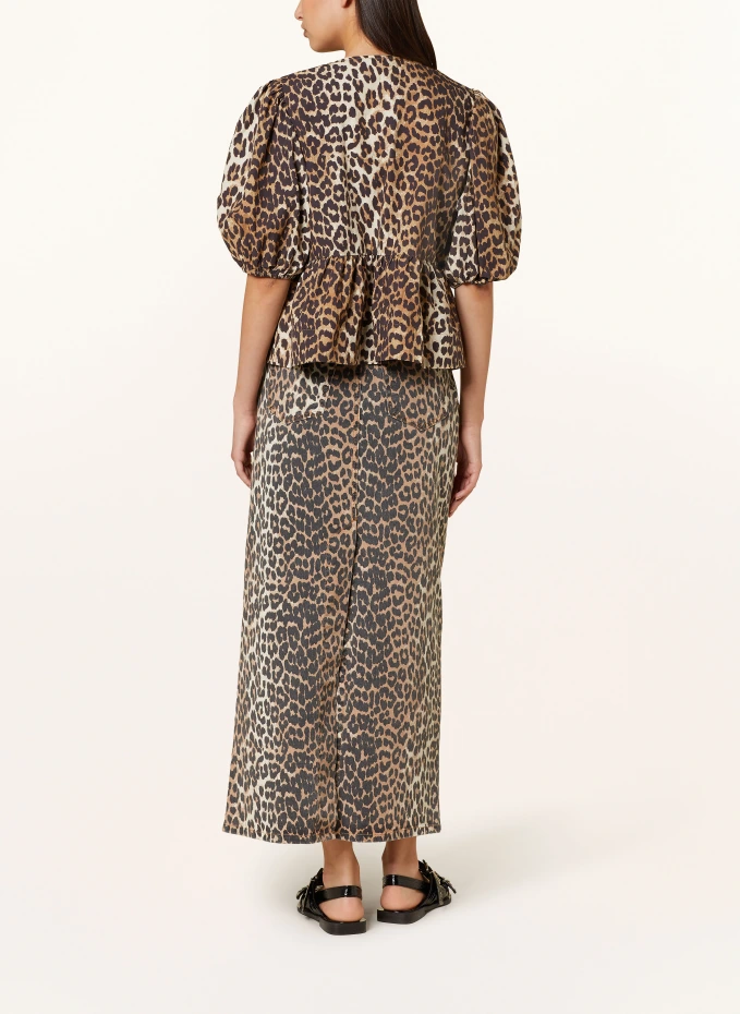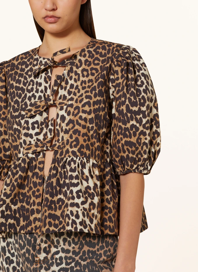 Прямого покроя. Круглый вырез. Закрывается сплошной лентой. Эластичные кончики рукавов. Баска на уровне талии. Отпечатки отдельных этикеток. Животный принт по всей поверхности. Чистый хлопок