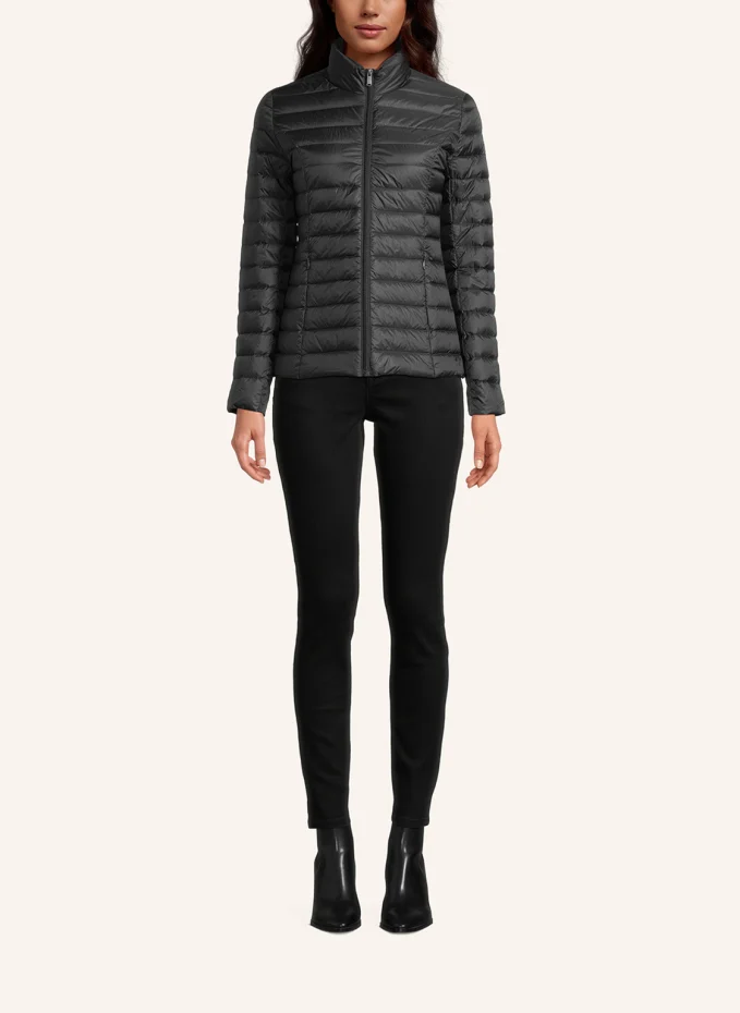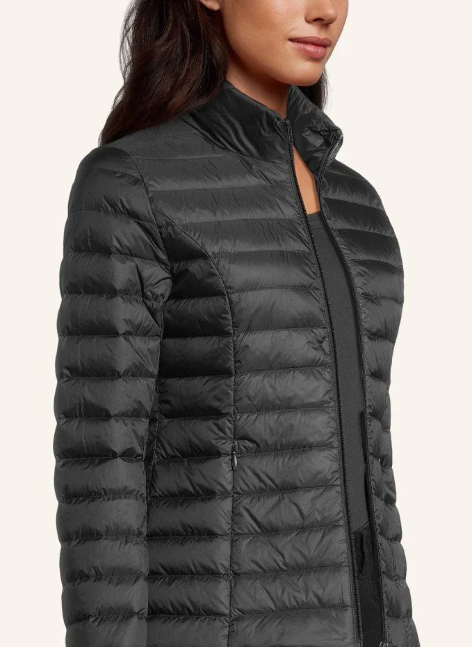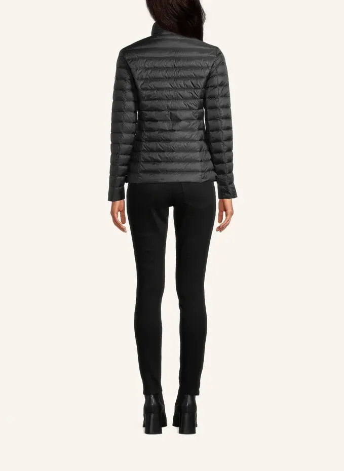 Атласный, стеганый и водоотталкивающий материал. Пухово-перьевой наполнитель с сертификатом «RDS». Плотный разрез. Небольшой стеганый воротник-стойка. Боковые карманы. Контрастные по цвету внутренние швы. Оригинальный фетровый логотип на левом рукаве.