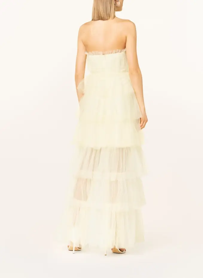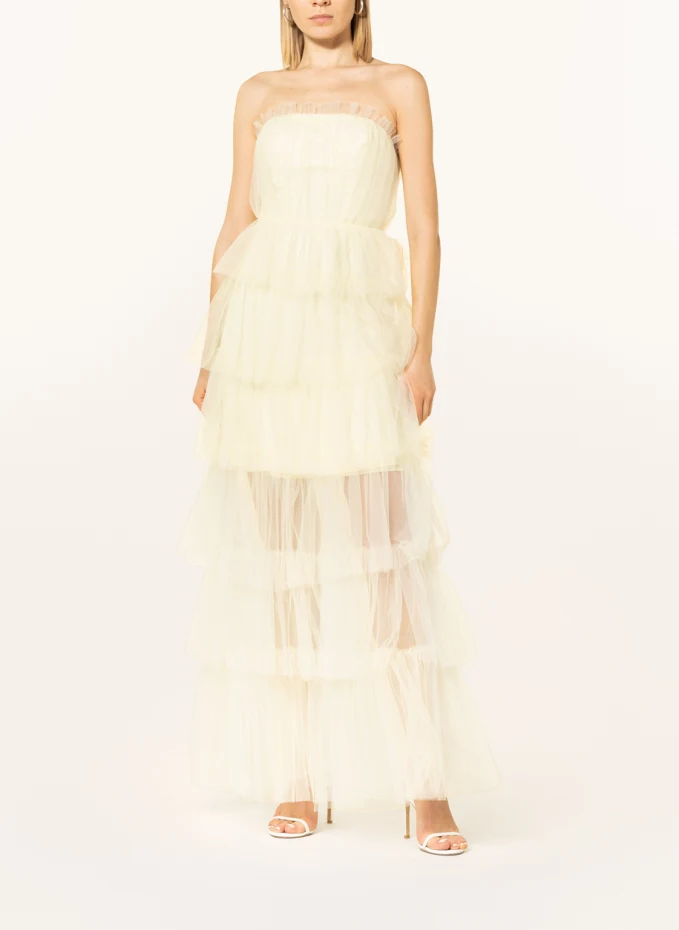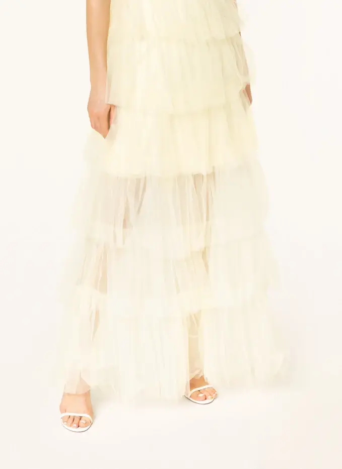 А-Силуэт. С плеча. Застегивается на тонкую молнию по центру спинки. Воланы по подолу. Обработка на подкладке. Качество тюля