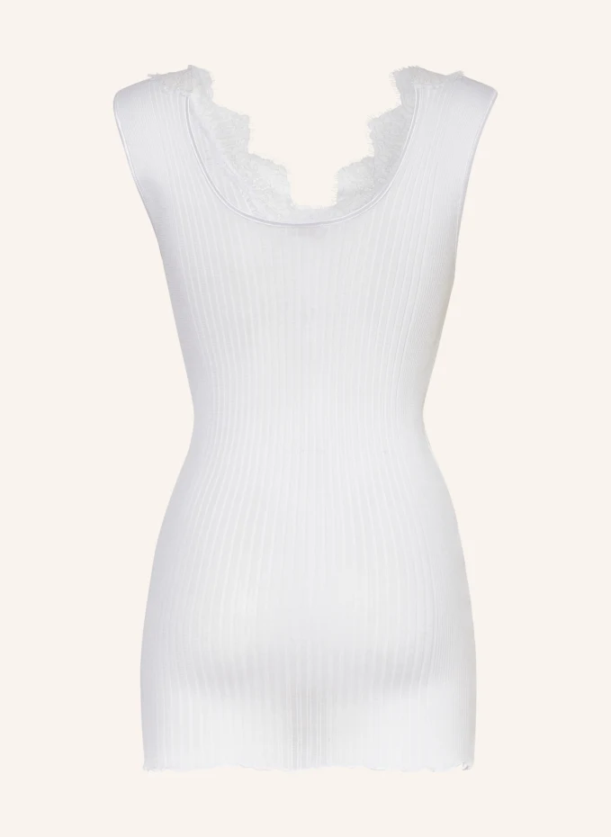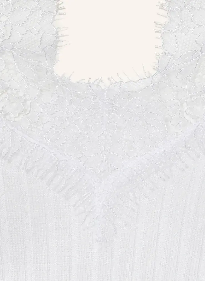 Облегающий фигуру крой. V-образный вырез с кружевом-ресничками. Широкие бретели. Оборчатый подол. Ришелье тонкое ребро. Чистый хлопок