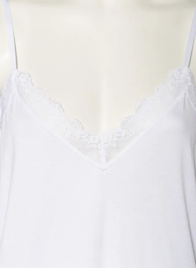 Прямого покроя. V-образный вырез. Регулируемые бретели-спагетти. Кружевная отделка по вырезу и подоле