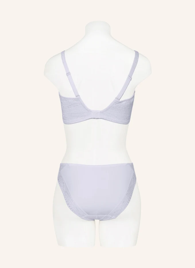 Мягкие чашки. Интегрированные храмы. Без боковых стержней. Широкий мост. Регулируемые бретели-спагетти. Бретельки с кружевной отделкой. Регулируется в три этапа сзади с помощью двух петель. Непрозрачная обработка. Бесшовная обработка. Кружевная отделка по всей поверхности