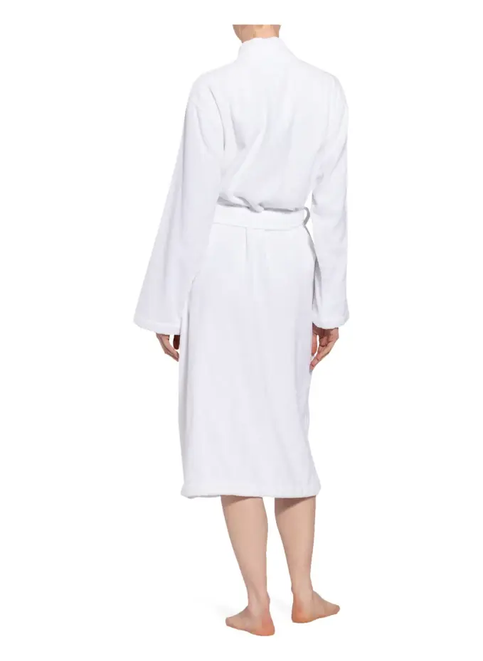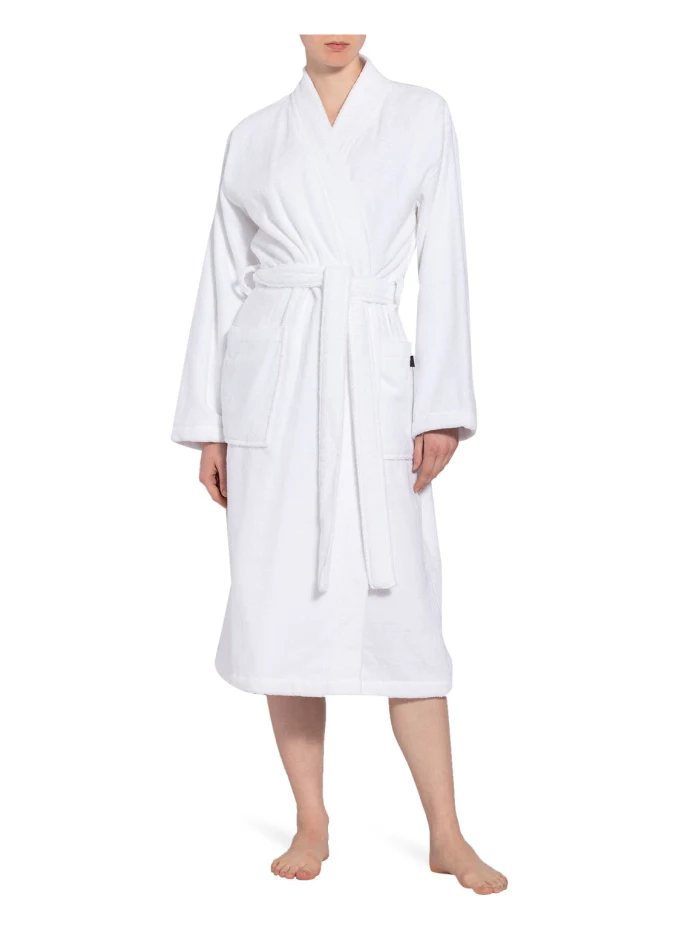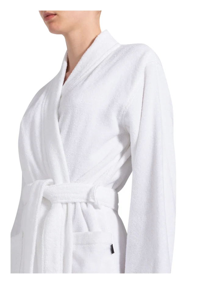 Махровая ткань. Шалевый воротник. Накладные боковые карманы. Пояс с двойными петлями для разного положения ремня. Подвесная петля. Боковой флаг с логотипом. Чистый хлопок