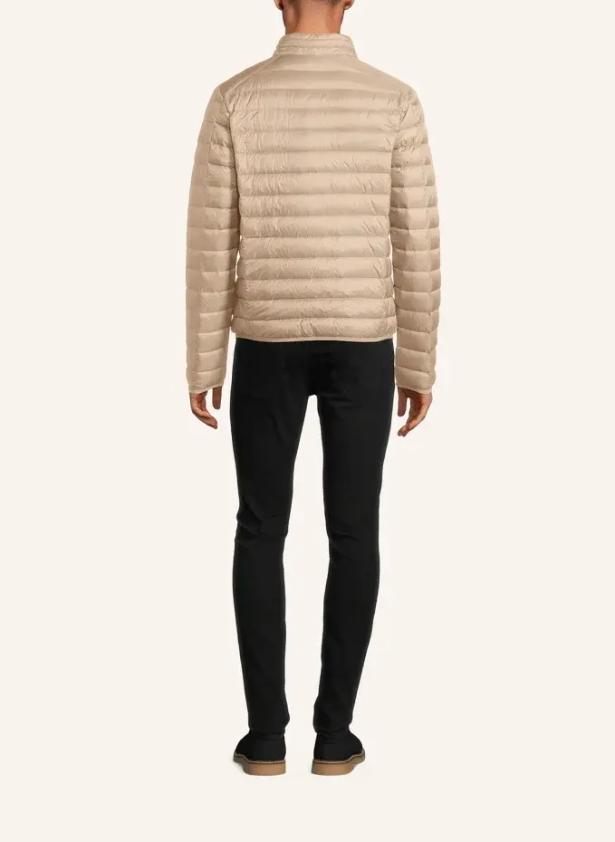 Атласный, стеганый и водоотталкивающий материал. Пухово-перьевой наполнитель с сертификатом «RDS». Плотный разрез. Небольшой стеганый воротник-стойка. Боковые карманы. Контрастные по цвету внутренние швы. Оригинальный фетровый логотип на левом рукаве.