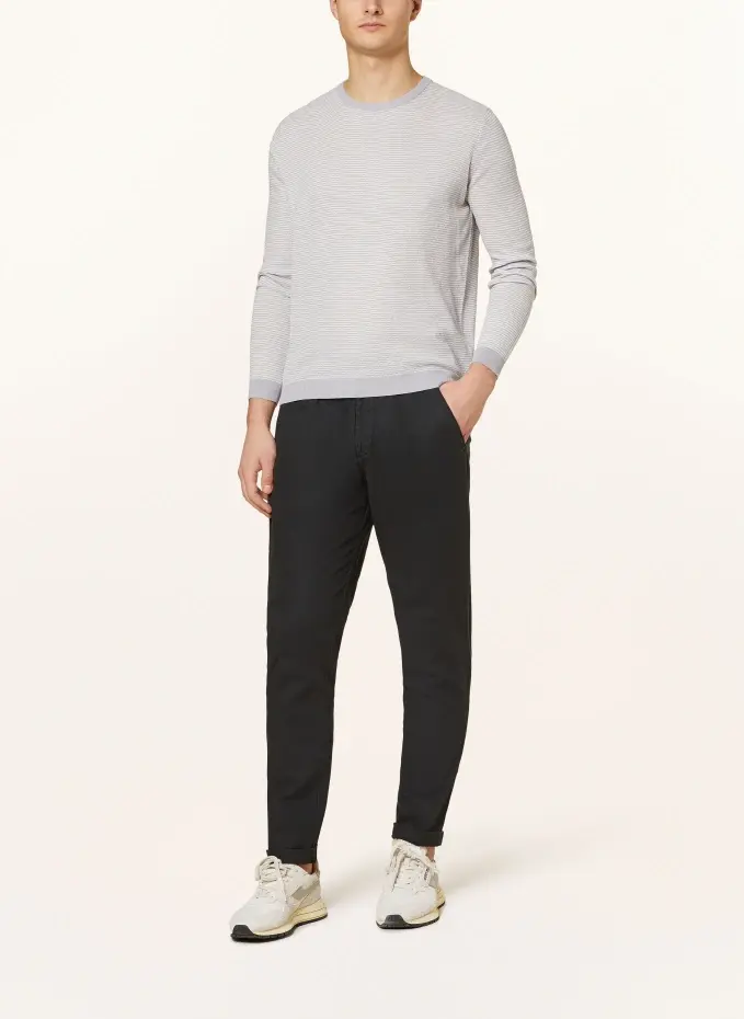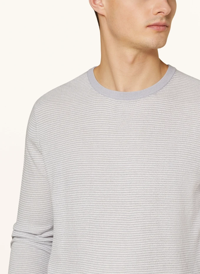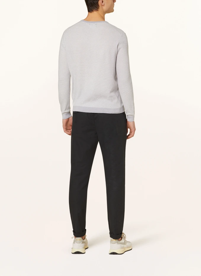 Структурная вязка. Прямого покроя. Круглый вырез. Ребристые манжеты и подол. Тонкий полосатый узор по всей поверхности. Чистый хлопок