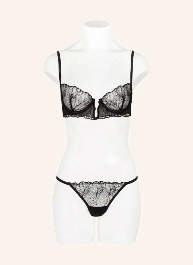 Интегрированные храмы. Без боковых стержней. Регулируемые бретели-спагетти. Регулируется в три этапа сзади с помощью двух петель. Боковые панели из прозрачной сетки. Прозрачная работа с нежной вышивкой. Вырезы сзади