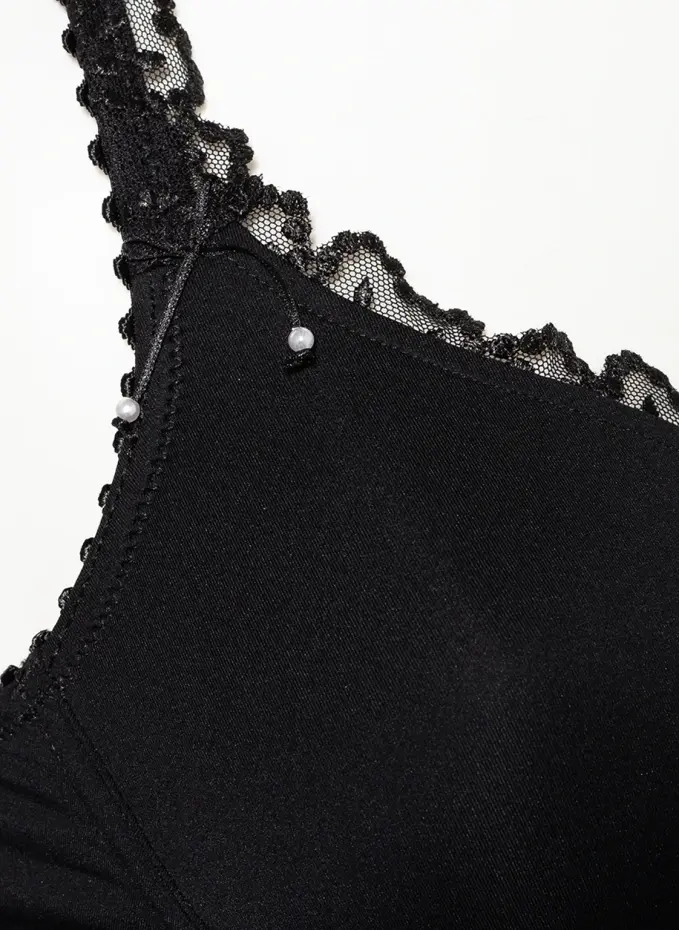Облегающий фигуру крой. Непрозрачная обработка. V-образный вырез. Мягкие чашки. Интегрированные храмы. Без боковых стержней. Эластичная лента под грудью. Регулируемые бретельки-спагетти с кружевной отделкой. Практически полностью закрывает дно. Застежка на крючок в промежности. Бесшовная обработка. Цветочные кружевные вставки