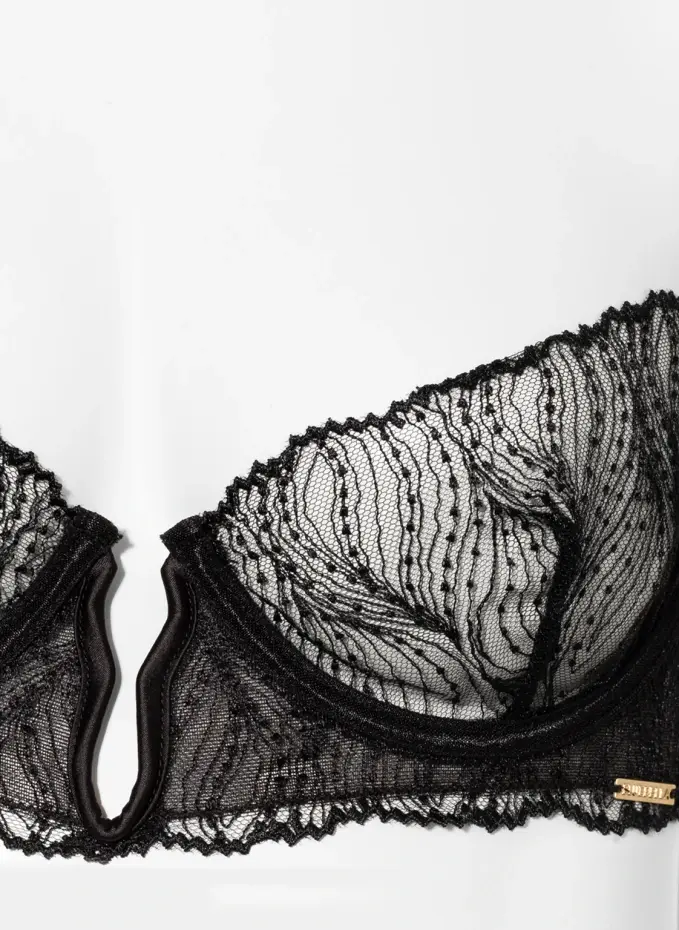 Интегрированные храмы. Без боковых стержней. Регулируемые бретели-спагетти. Регулируется в три этапа сзади с помощью двух петель. Боковые панели из прозрачной сетки. Прозрачная работа с нежной вышивкой. Вырезы сзади