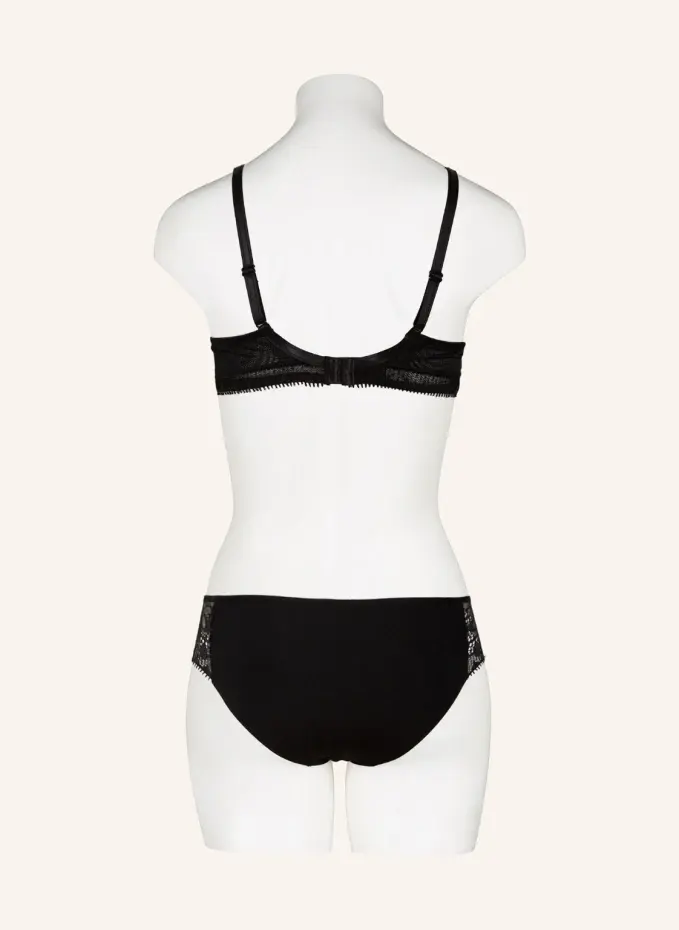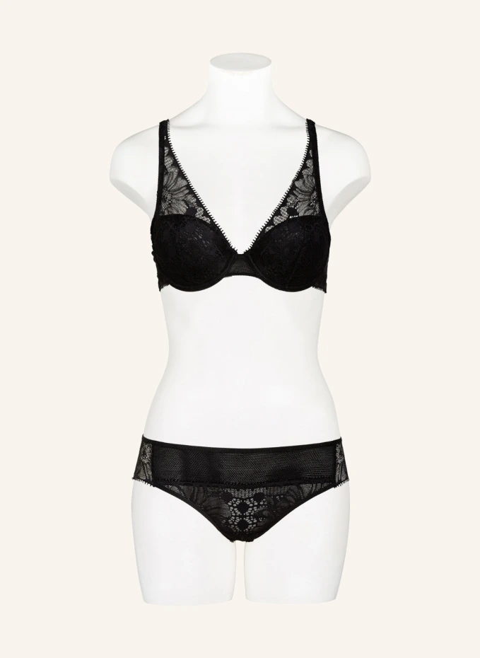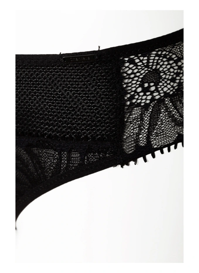 Боковые вставки из прозрачного кружева. Спереди на подкладке из непрозрачной ткани. Пояс до бедра. Прямой крой штанин. Хлопковая ластовица. Выполнение цветочного кружева. Почти полностью закрывает дно