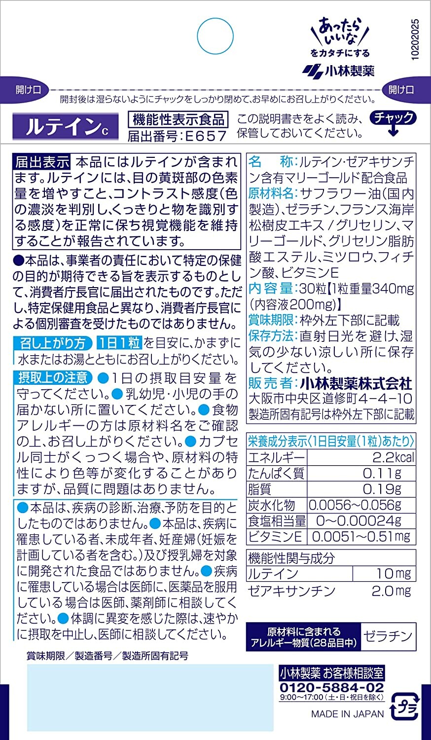 Этот продукт содержит лютеин. Сообщалось, что лютеин увеличивает количество пигмента в макуле глаза и поддерживает нормальную контрастную чувствительность (чувствительность к различению оттенков цвета и четкому различению объектов) для поддержания зрительной функции.