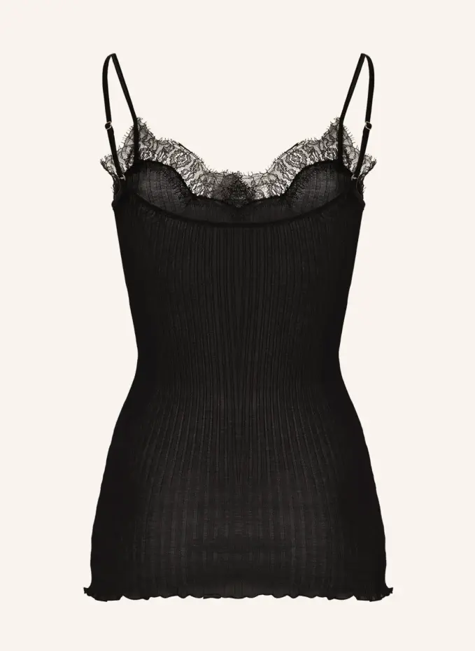 Облегающий фигуру крой. V-образный вырез с кружевом-ресничками. Регулируемые бретели-спагетти. Оборчатый подол. Тонкое ребро. Чистый хлопок