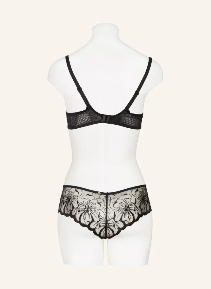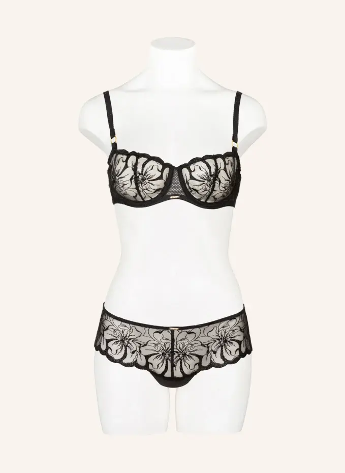 Прозрачная кружевная отделка. Пояс до бедра. Прямой крой штанин. Центральный разделительный шов спереди и сзади. Хлопковая ластовица. Практически полностью закрывает дно. Золотистая пластинка с логотипом спереди. Цветочная вышивка