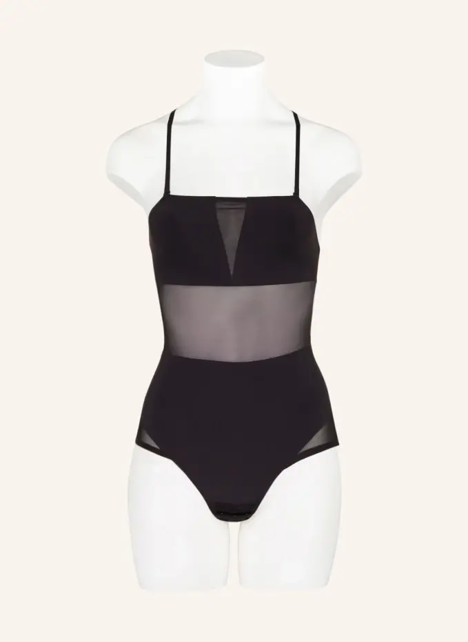 Формирующий эффект: средняя степень. Облегающий фигуру крой. Прозрачные сетчатые вставки. Круглый вырез. Не железный. Без боковых стержней. Регулируемые бретели-спагетти. Хлопковая ластовица. Полное закрытие ягодиц.Регулируемая застежка на крючок в промежности. Бесшовная обработка. Изготовлено из переработанных материалов