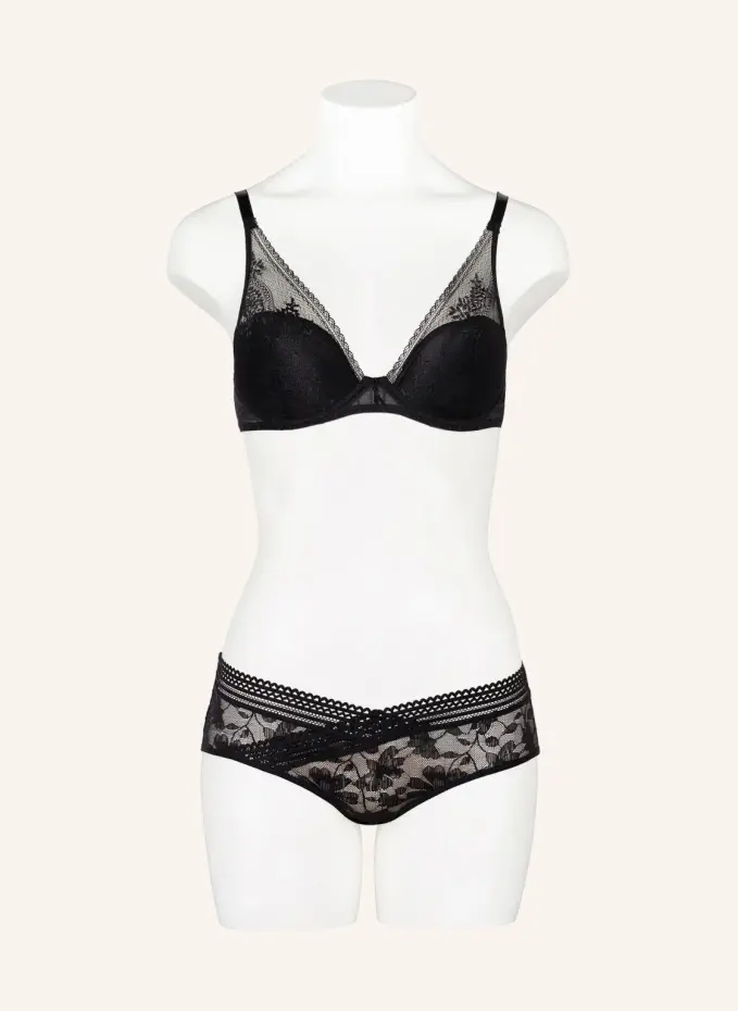 Мягкие чашки. Вертикальный шов для особенно хорошего подъемного эффекта. Интегрированные храмы. Без боковых стержней. Узкий мост с декоративным бантиком. Регулируемые бретели-спагетти. Регулируется в три этапа сзади с помощью двух петель. Прозрачные боковые части и прозрачная спинка из сетки. Непрозрачная обработка. Кружевная отделка