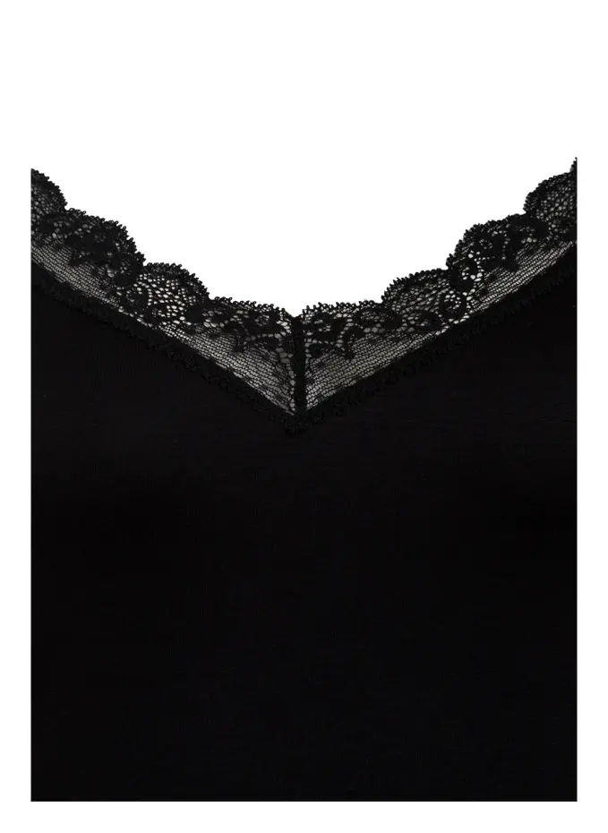 Прямого покроя. V-образный вырез с кружевным декором. Регулируемые бретели-спагетти. Эластичная обработка