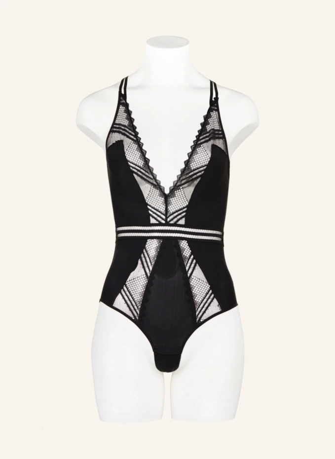 Облегающий фигуру крой. Прозрачные вставки. Не железный. Без боковых стержней. Регулируемые бретели-спагетти. Хлопковая ластовица. Полное закрытие низа. Кнопки в промежности. Вышивки. Изготовлено из переработанной пряжи