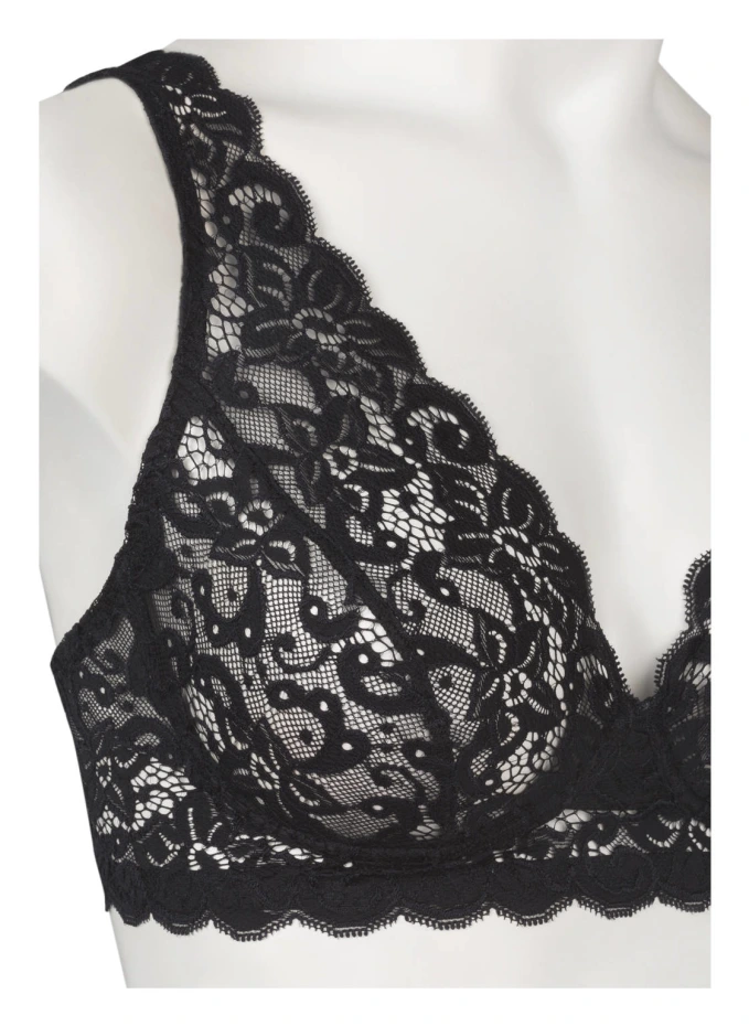 Не железный. Без боковых стержней. Широкие кружевные бретели. Регулируется в три этапа сзади с помощью двух петель. Полупрозрачное кружевное покрытие.