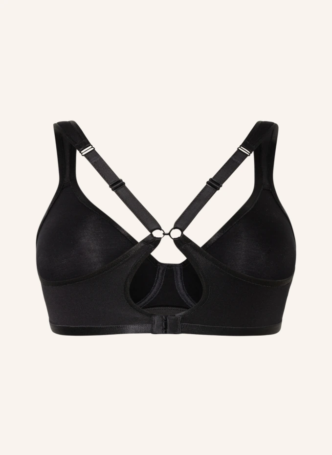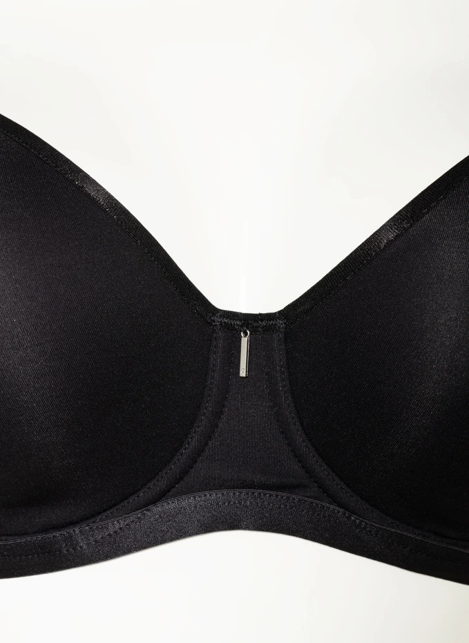 Формованные чашки. Бесшовные чашки заданной формы. Интегрированные храмы. Без боковых стержней. Эластичная лента под грудью. Широкая перемычка с серебристой аппликацией. Регулируемые бретели. Различные варианты ношения. Регулируется в три этапа сзади с помощью двух петель. Непрозрачная обработка. Бесшовная обработка. Подходит как бюстгальтер-майка.