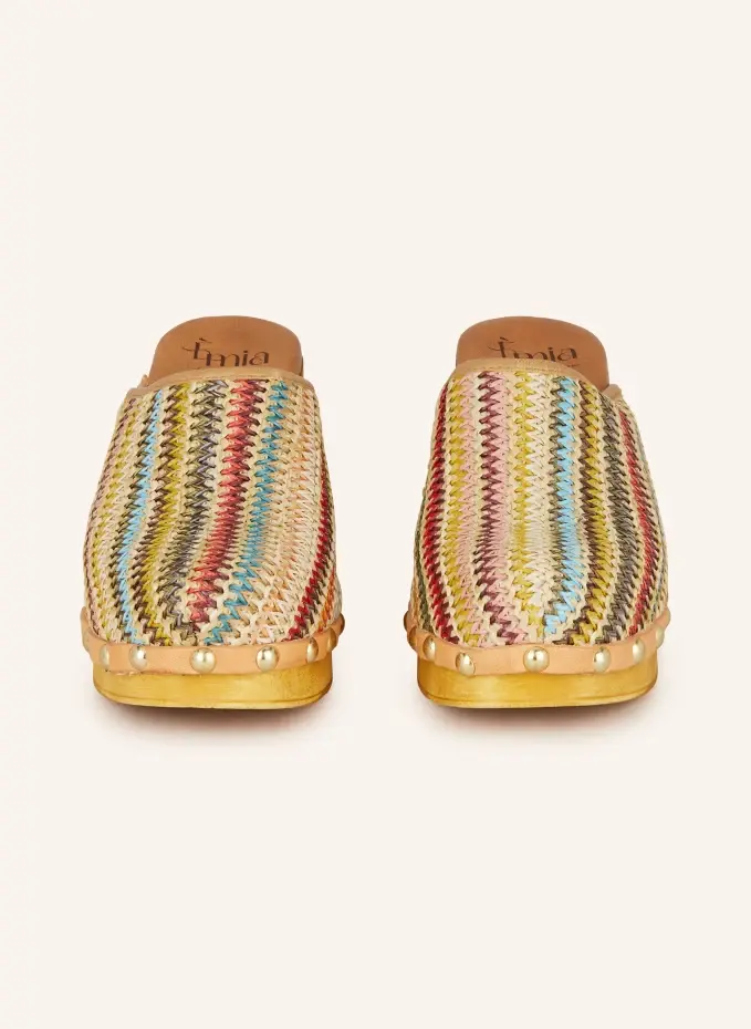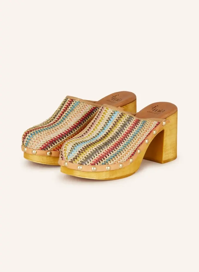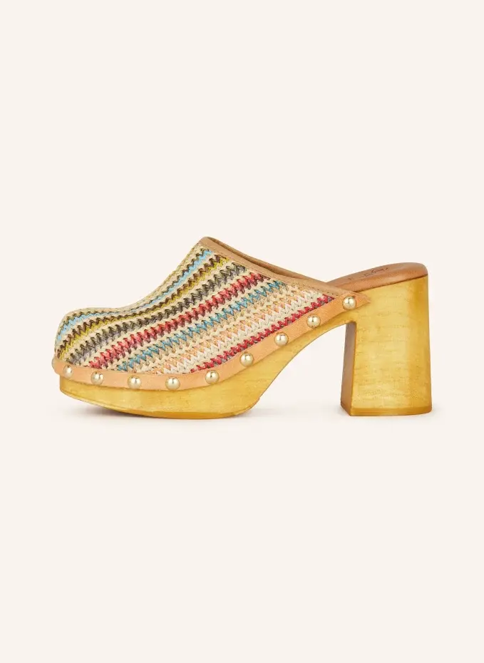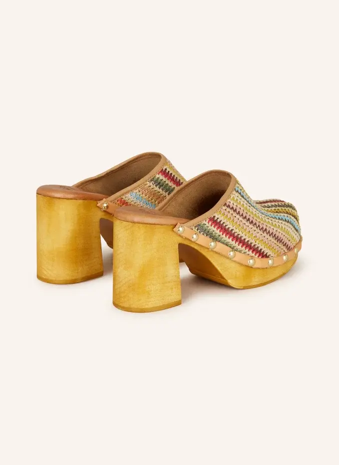 Рафия и кожа. Металлические детали золотистого цвета. Отделка заклепками на подошве. Закрытый носок. Передняя часть миндалевидная. Деревянная подошва. Подошва на платформе с каблуком. Подошва с рифленой структурой. Сделано в Италии