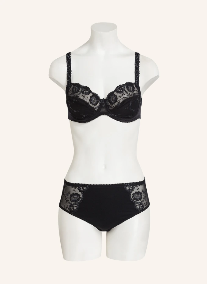 Непрозрачная обработка. Высокий лад. Высокий вырез по ноге. Бесшовная обработка на спине: никаких маркировок. Полупрозрачные вставки из расшитого фатина. Полностью закрывает дно. Эластичные манжеты на ногах