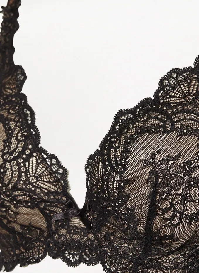 Вертикальный шов для особенно хорошего подъемного эффекта. Интегрированные храмы. Без боковых стержней. Регулируемые бретели. Бретельки с кружевной отделкой. Регулируется в три этапа сзади с помощью двух петель. Прозрачное изделие из тюля и цветочного кружева.