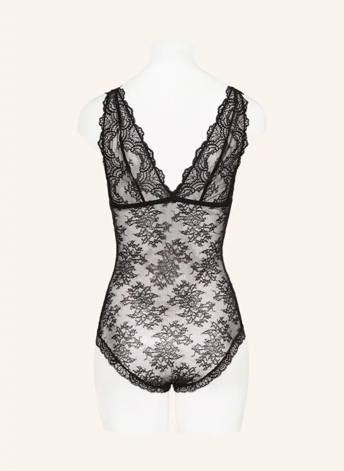 Облегающий фигуру крой. Прозрачное цветочное кружево. V-образный вырез. Не железный. Без боковых стержней. Без рукавов. В области промежности подкладка из непрозрачной ткани. Хлопковая ластовица. Полное закрытие позиции, липучка в разрезе.