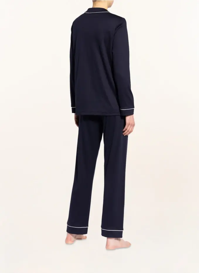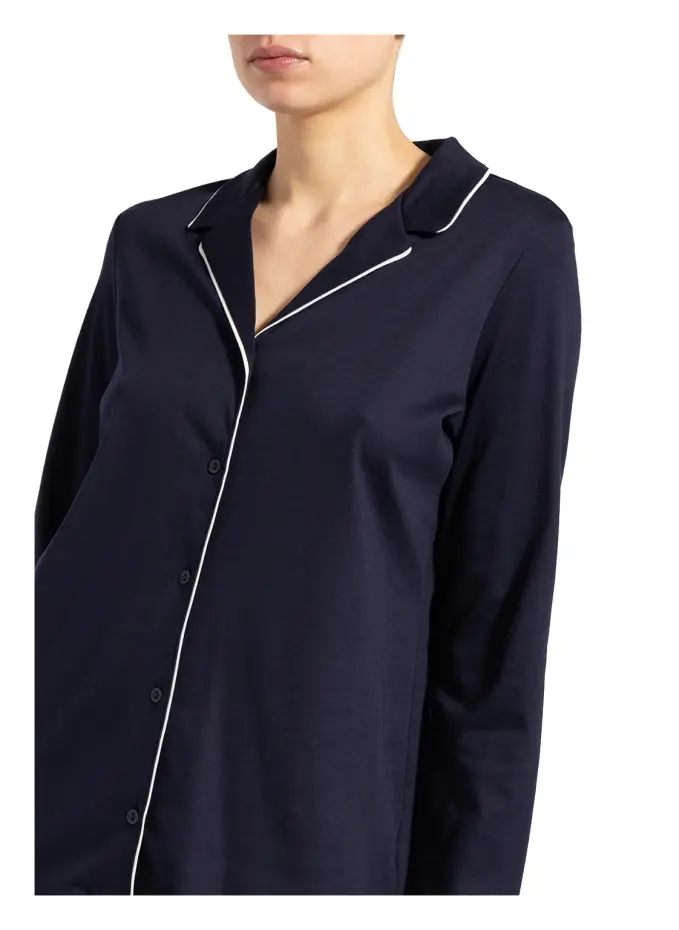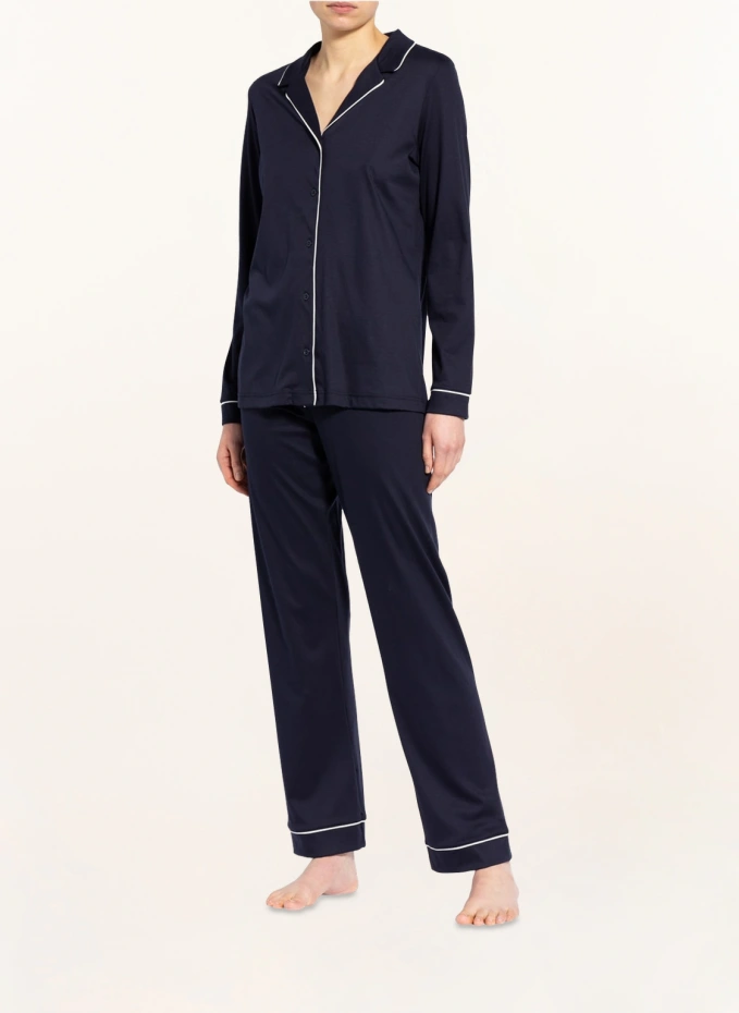 Рубашка: Прямого кроя. Воротник с лацканами. Длинный рукав. Непрерывная планка с пуговицами. Контрастная окантовка на горловине, планке с пуговицами и концах рукавов. Чистый хлопок. Брюки: эластичный пояс. Прямая нога. Чистый хлопок