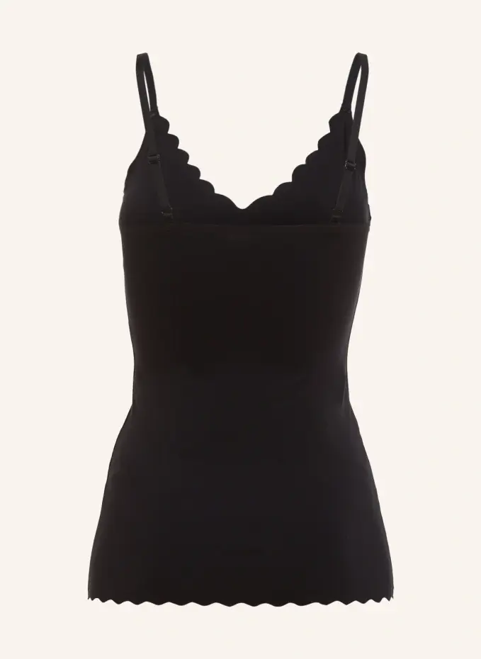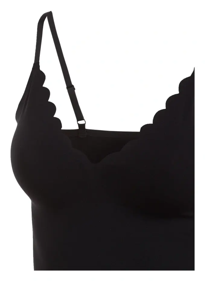 Плотный разрез. V-образный вырез с фестончатым краем. Регулируемые по длине бретели-спагетти. Съемные подушечки. Зубчатый низ по низу. Плоские концы. Качество растяжки. Прекрасное, гладкое ощущение