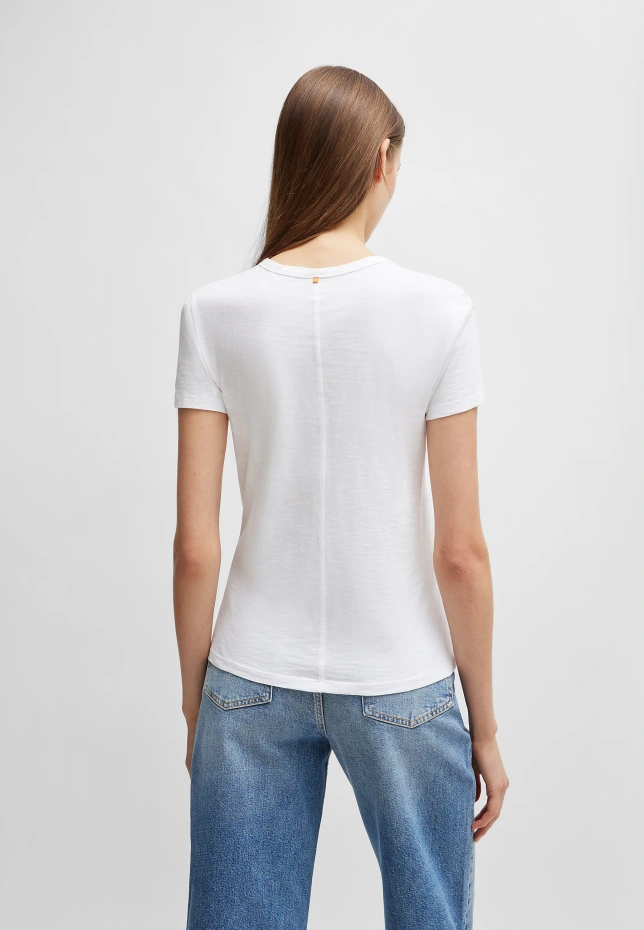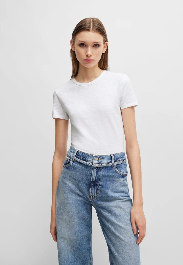 Универсальная футболка BOSS из структурированного легкого хлопка прямого кроя. Для производства нашей продукции BETTER BOSS мы используем как минимум на 60 % лучшее сырье. Этот продукт изготовлен из органического хлопка. Наши органические стандарты не допускают использования синтетических удобрений, пестицидов или генетически модифицированных семян. Регулярная посадка. Совок шеи. Короткие рукава.