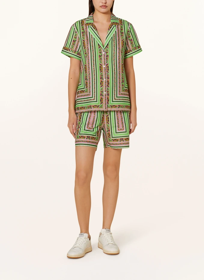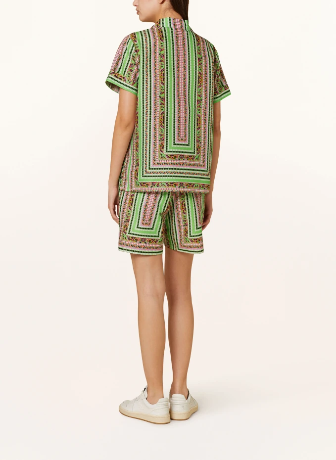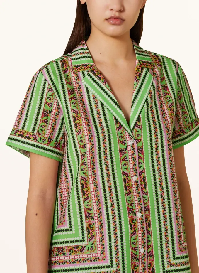 Прямого покроя. Воротник с лацканами. Закрывается на непрерывную гладкую планку на пуговицах. Короткий рукав. Манжеты на концах рукавов. Боковые разрезы. Сплошной узор. Чистый хлопок
