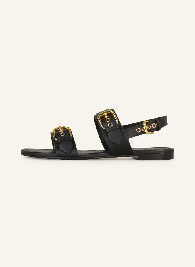 Гладкая кожа. Металлические детали золотистого цвета. Широкие бретели с пряжками на подъеме. Ремешок на пятке с застежкой. Передняя часть миндалевидная. Нескользящая подошва. Сделано в Италии