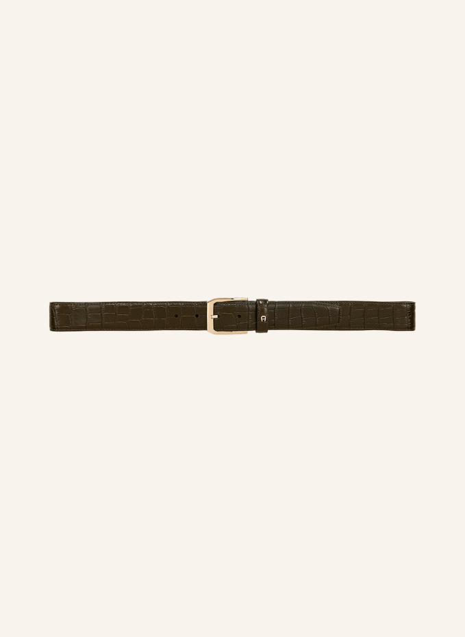 Блестящая пряжка серебристого цвета. Пластинка с логотипом AIGNER на петле. Коровья кожа с тиснением под крокодила.
