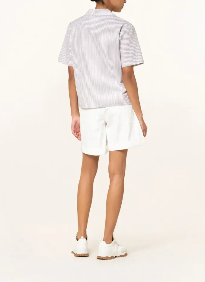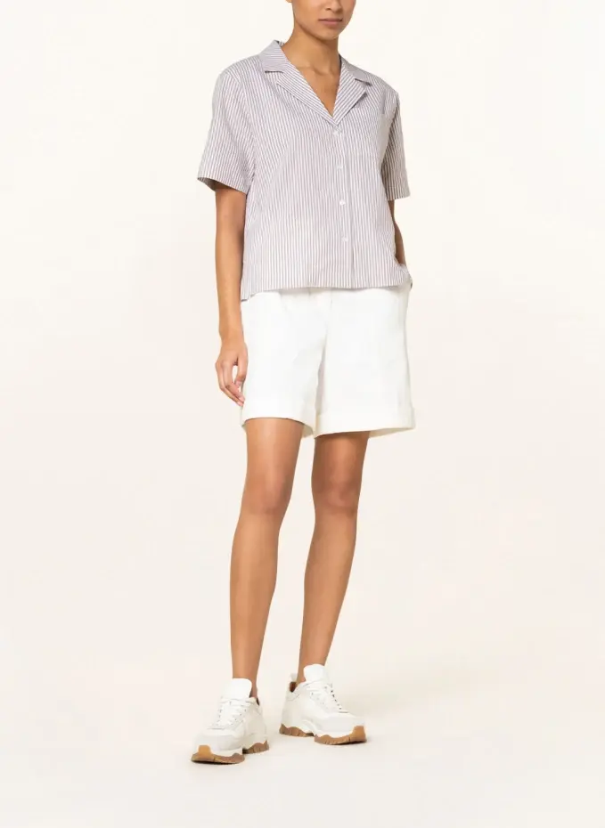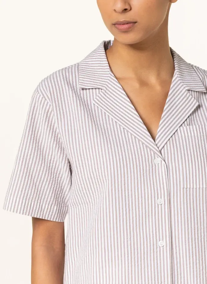 Прямого покроя. Воротник рубашки. Короткие рукава. Закрывается на непрерывную гладкую планку на пуговицах. Нагрудный карман. Короткие разрезы по бокам. Полосатый узор. Качество хлопчатобумажной ткани