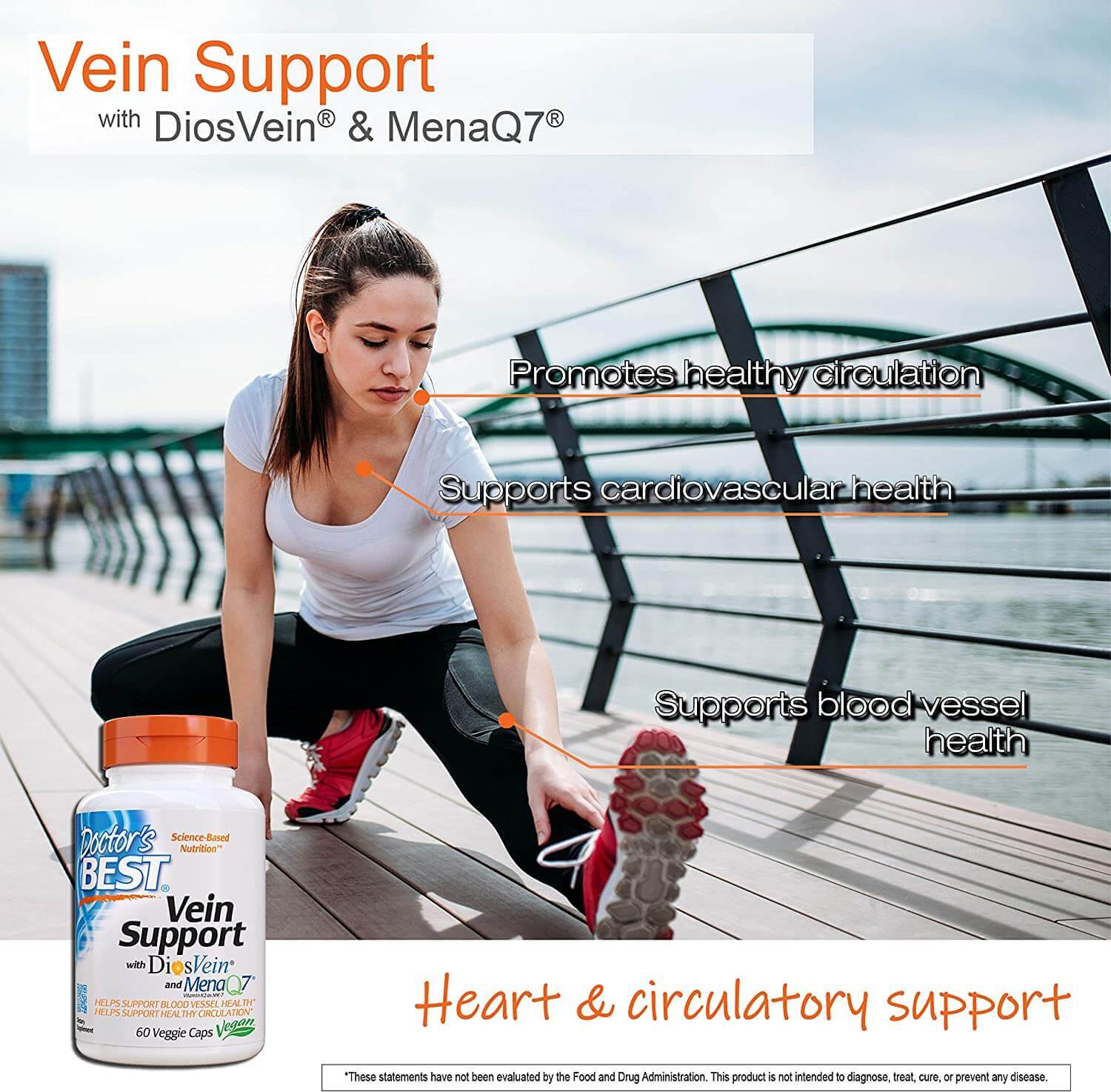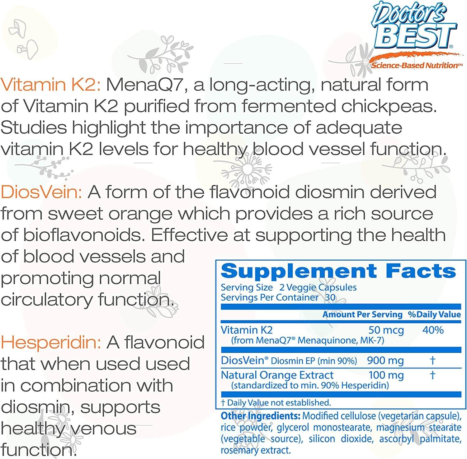 Принимайте Doctor's Best Vein Support, DiosVein, MenaQ7, чтобы улучшить состояние вен, снизить риск развития варикоза. Добавка благоприятно воздействует на вены и на кровеносную систему, улучшая кровообращение и отток лимфы.