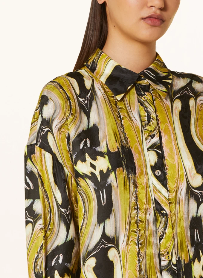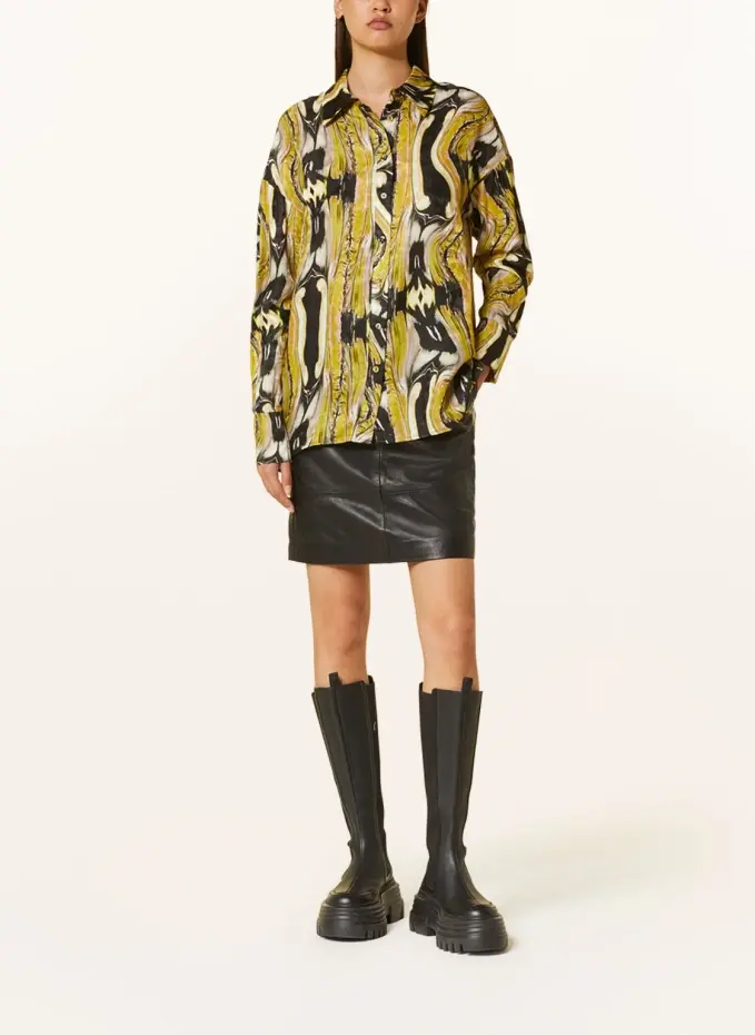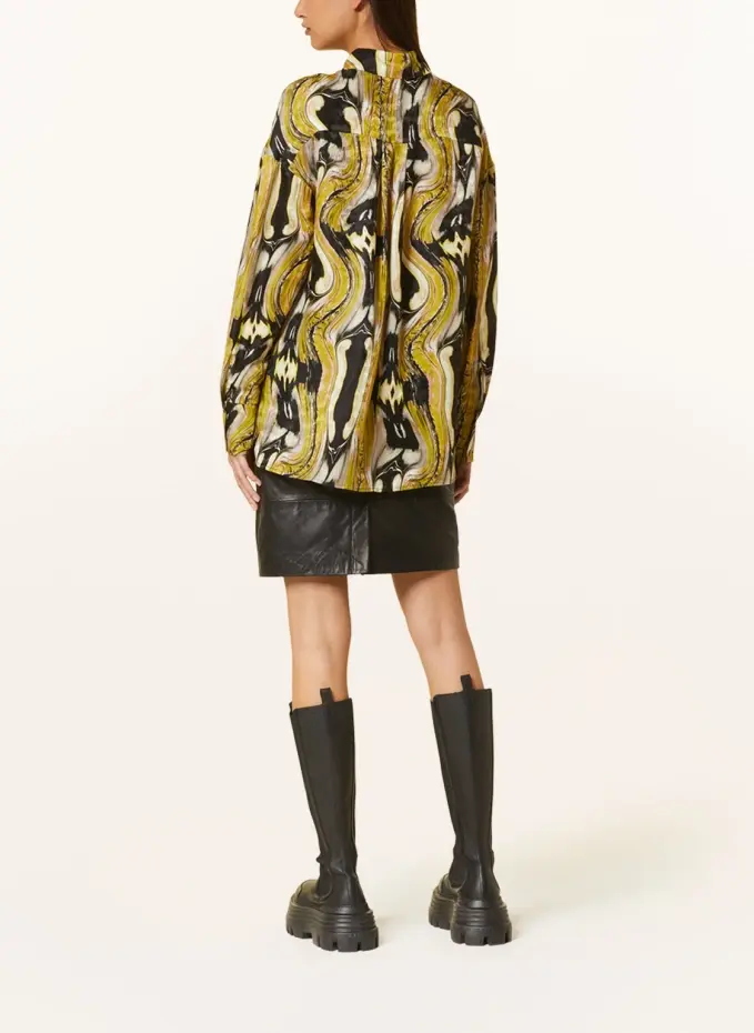 Выкройка оверсайз. Воротник рубашки. Закрывается на прикреплённую планку с пуговицами. Перерез плеч. Манжета на двух пуговицах. Складывание на спине. Короткие разрезы по бокам на подоле. Сплошной узор. Легкое, гладкое ощущение. С шелком
