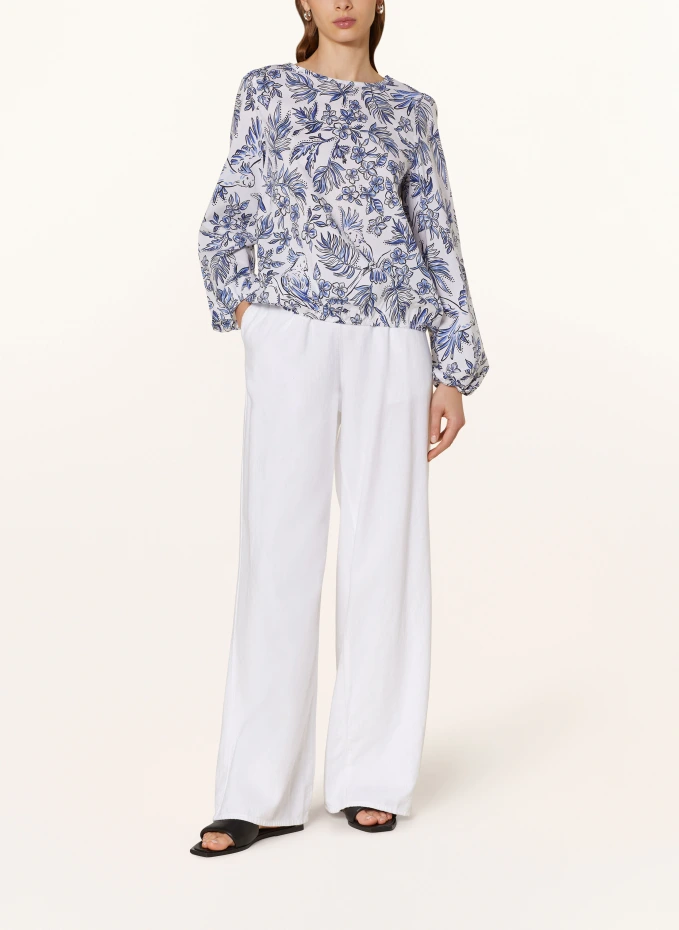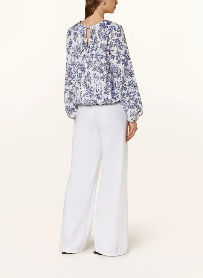 Прямого покроя. Закрывается бантиком на шее. Сзади короткий V-образный вырез. Эластичные кончики рукавов. Эластичный подол. Цветочный узор по всей поверхности. Чистый хлопок